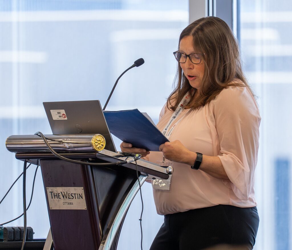 Laurie Proulx, a patient partner on the ARCHIMEDES Data Access Committee (DAC), speaking at the Canadian Health Data Platform Summit, Oct. 7, 2025.
